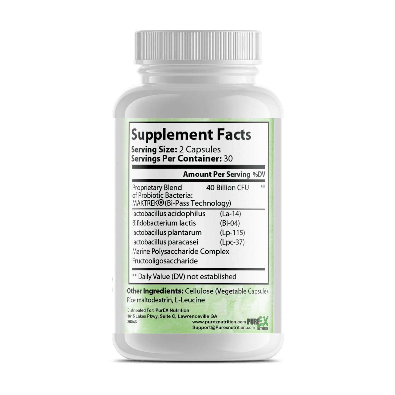 Pure Probiotics contain 40 billion units of colony forming units(CFU) to help improve or balance your microbiota. With MAKTrek® Bi-Pass Technology Pure Probiotics is formulated for a higher level of absorption. MAKTrek® Bi-Pass Technology is a patented formula that helps to improve the absorption of probiotics specifically within the body. MAKTrek® works by protecting the capsule with a protective layer keeping it safe in the stomach. This is so that it isnt broken down early by digestive enzymes in the stomach or intestines.